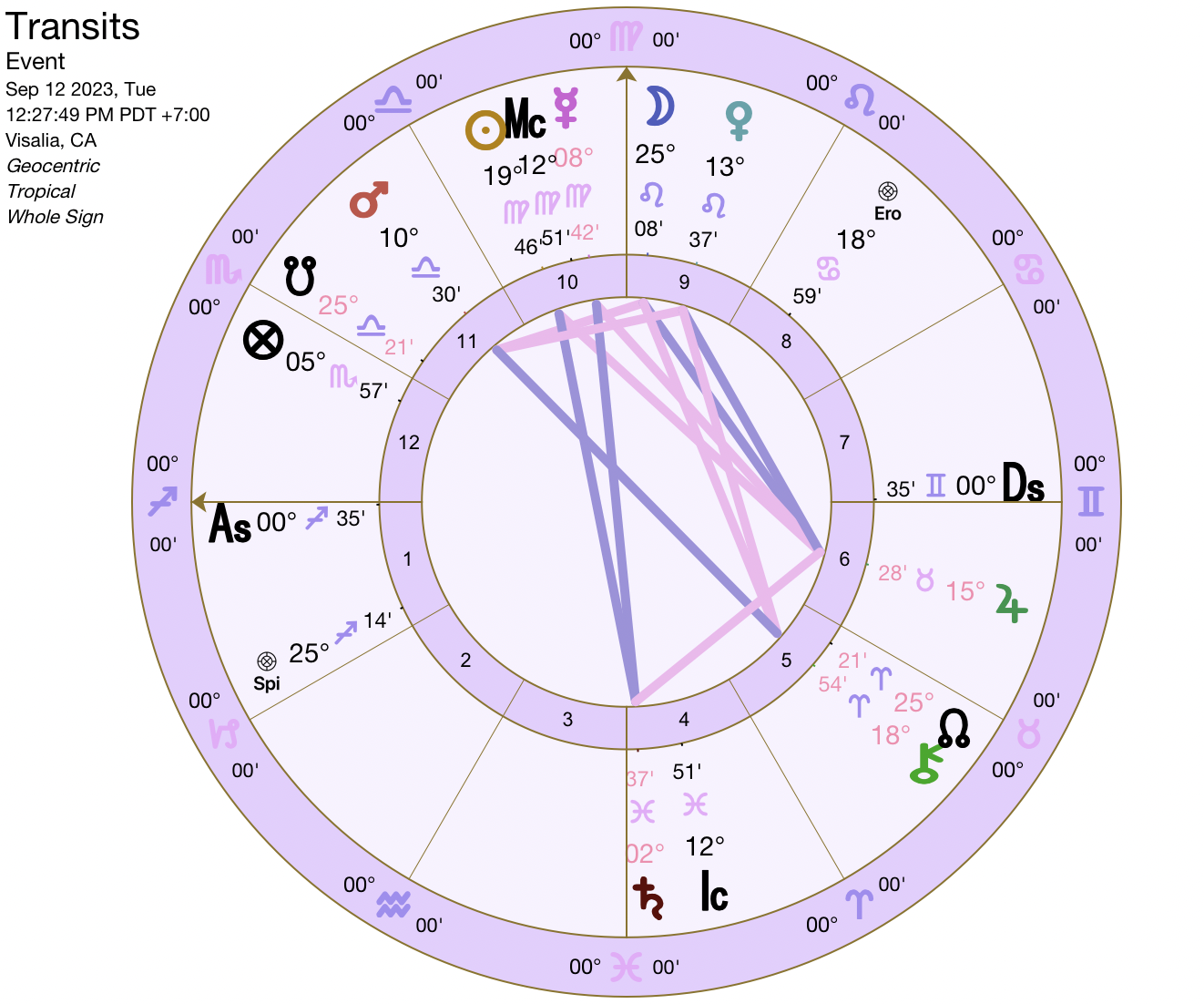 Let’s look at this transit chart as an example! Imagine someone born at this time is trying to write their first book. They know that writing is important to them: Virgo Sun and Mercury, hello! But they don’t know what they want to write, or how they want to write it.